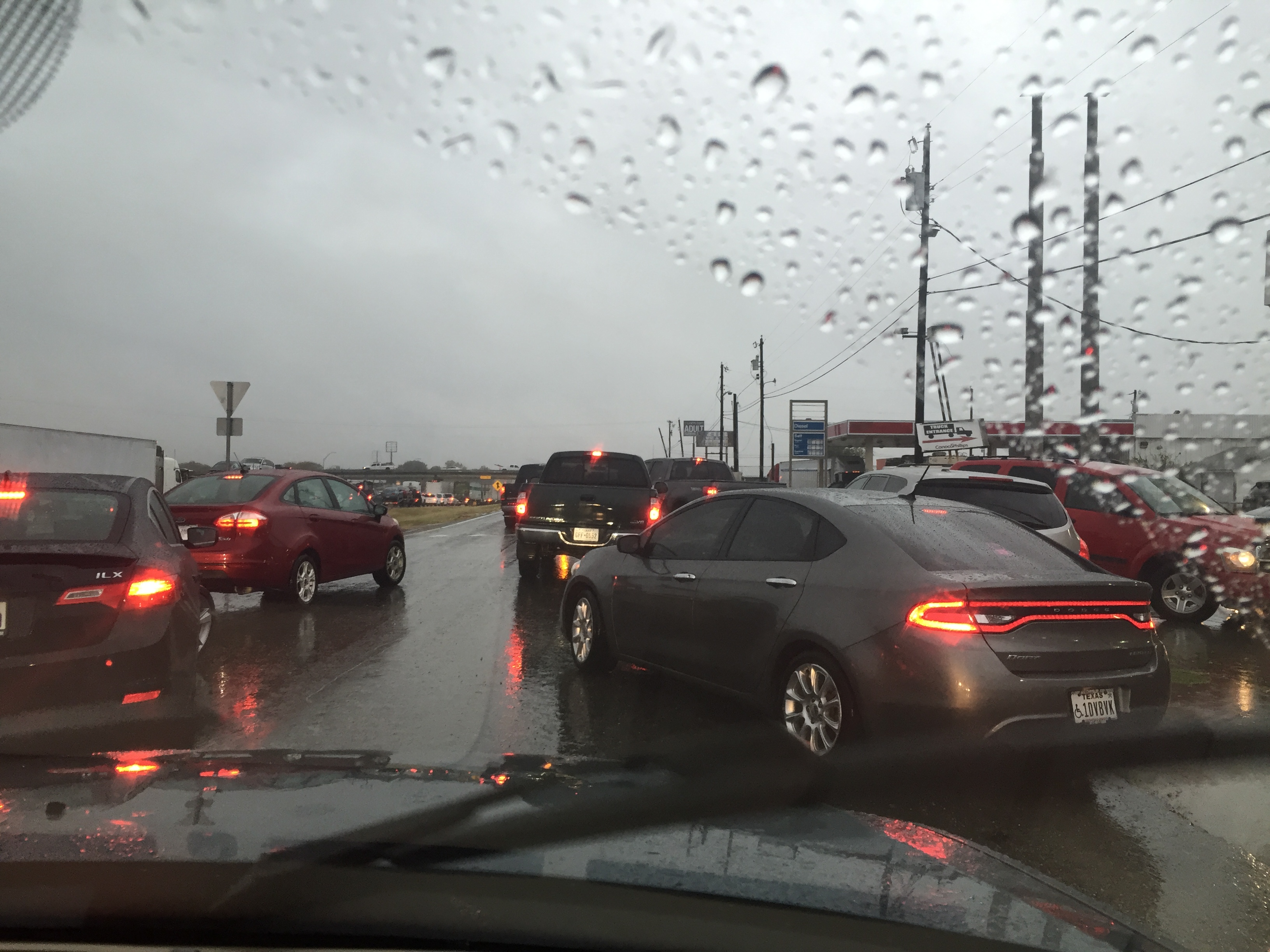 This weekend, we celebrated Neil’s 27th birthday as well as the 20th anniversary of a camping trip we go on with friends and family. Needless to say, it was a jam-packed weekend of fun. But it was also a jam-packed weekend of floods. With the impending doom forecasted for most of the state, we chose to cancel the camping trip and have a house party instead. But that still meant Neil and I had to make the journey to Dallas in the middle of the storm. Naive and reeling from our birthday-beverage-induced euphoria (boba tea), we both took half days from work and set out for D-town around 2pm. We arrived almost nine hours later. Without going into all the details, I-45 northbound was shut down in Corsicana due to flood waters covering the highway. This is us before we realized the seriousness of the traffic problems: