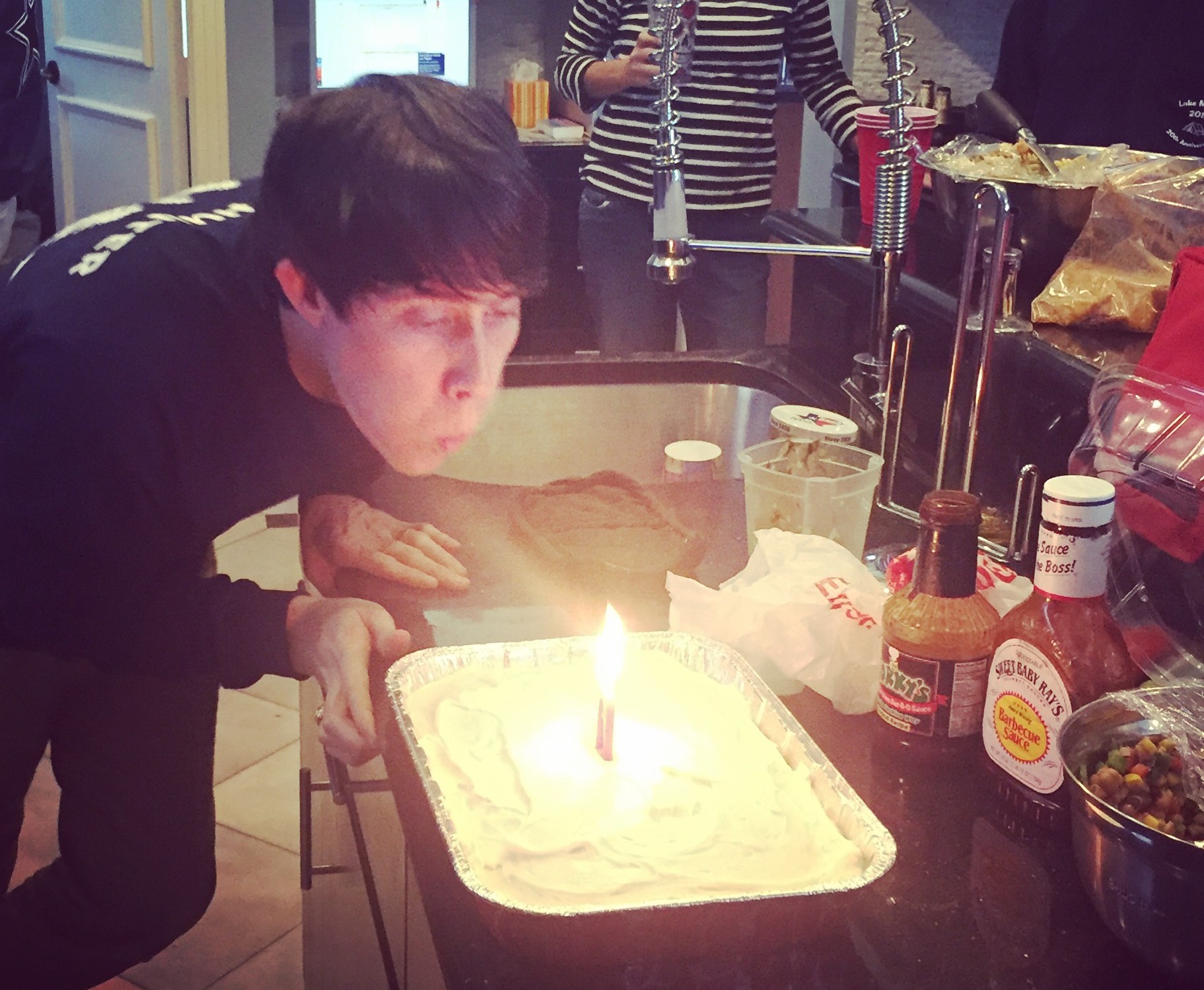 The next morning, was Neil’s birthday! We celebrated with another birthday beverage (Starbucks) and headed up to McKinney for the faux-camping house party at my Dad and stepmom’s house (thanks for hosting!). We spent the day playing Balderdash and Resistance, roasting marshmallows, eating food, and catching up with old friends. Oh, and eating birthday cake.