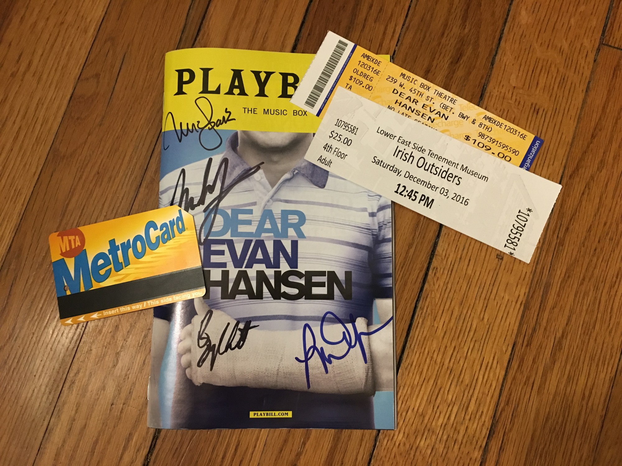 Not only was the show phenomenal, but it was really fun to experience a new musical for the first time with Neil. Usually, we’ve heard the music before or seen the recording, but this time we got to dive into an original story together. After the show, Neil got us some water bottles while I waited outside the stage door to get the cast to sign my Playbill (I collect them). I ended up standing next to the parents of one of the actors and spent the wait talking to them about how excited they were to see their son on Broadway. Signatures obtained, I found Neil and we made our way back to our room and passed out.